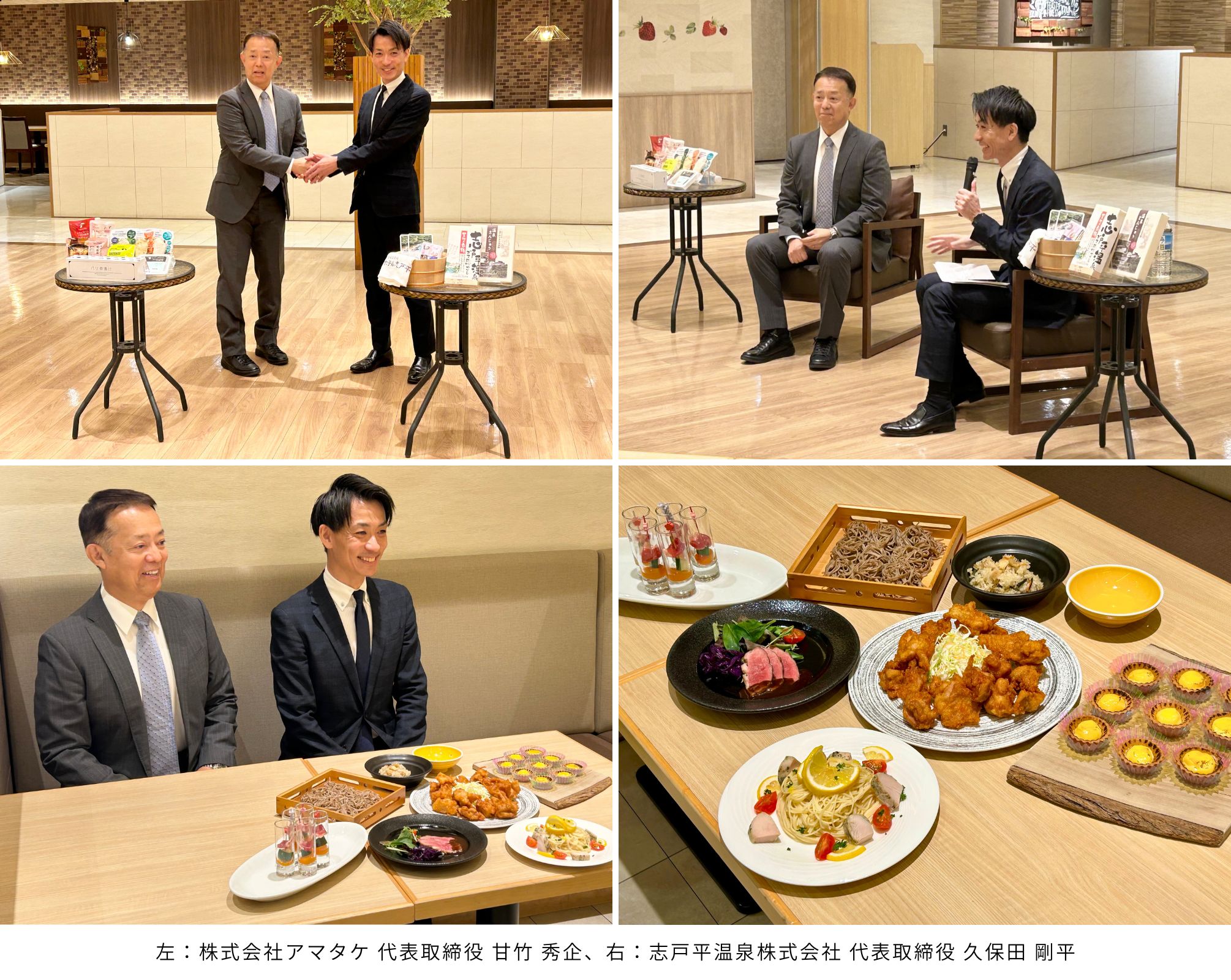 今回のコラボイベントは、湯の杜 ホテル志戸平による地域共創企画の第3弾として実施されるものです。本発表会には、志戸平温泉株式会社 代表取締役 久保田 剛平と、株式会社アマタケ 代表取締役 甘竹 秀企の両社代表が出席しました。