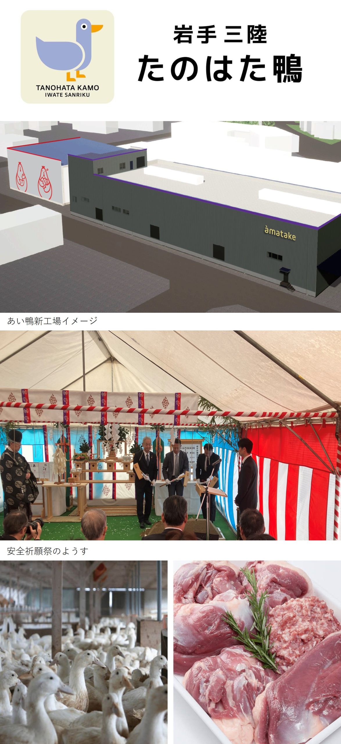 本工場は、2026年3月1日にブランド名を刷新した「岩手三陸たのはた鴨」の増産に対応するための拠点として整備するものです。2026年秋の完成・稼働を予定しており、あい鴨肉処理工場としては国内最大規模となる見込みです。 施設は鉄筋コンクリート造・平屋建て、延床面積約400坪。あい鴨肉処理に特化した設備の導入により、高品質かつ効率的な加工体制を構築し、今後の需要拡大にも対応してまいります。 また、田野畑村の豊かな自然環境で育てられた「岩手三陸たのはた鴨」は、さらなる生産拡大を進めており、将来的には年間80万羽規模の生産を目指しています。本工場はその中核的な役割を担います。